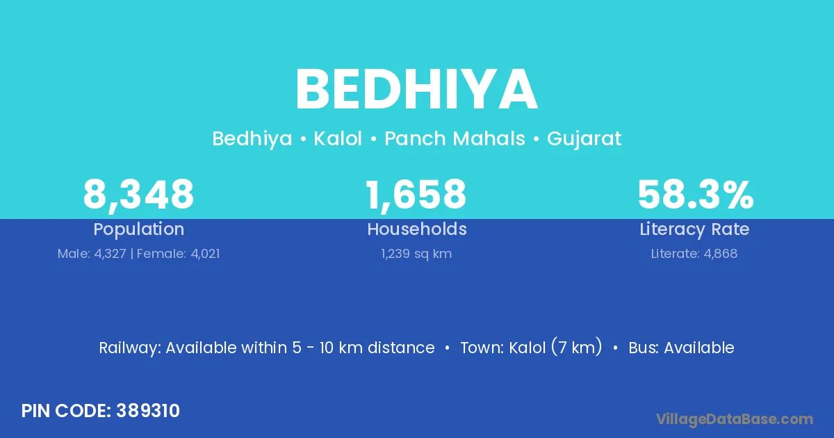 Kalol (7 km) is the nearest town to Bedhiya village for major economic activities and is located approximately 7 km away.