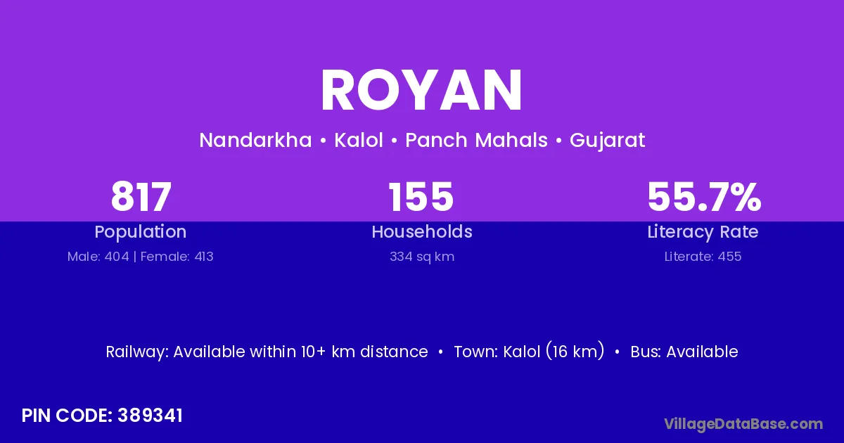 Kalol (16 km) is the nearest town to Royan village for major economic activities and is located approximately 16 km away.