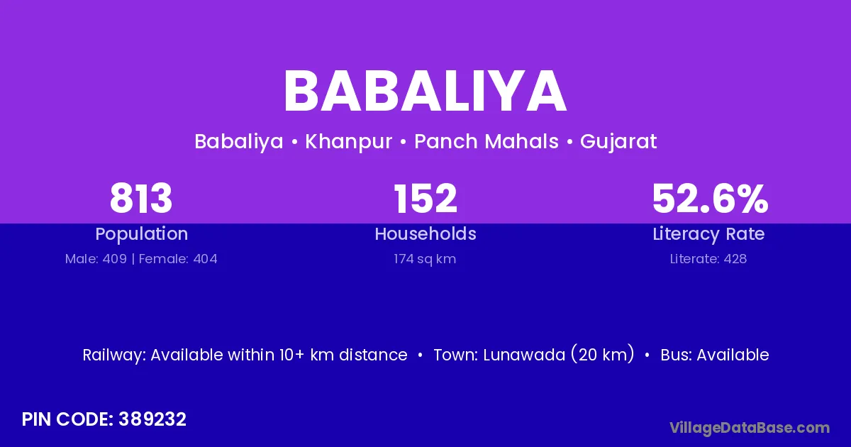 Lunawada (20 km) is the nearest town to Babaliya village for major economic activities and is located approximately 20 km away.