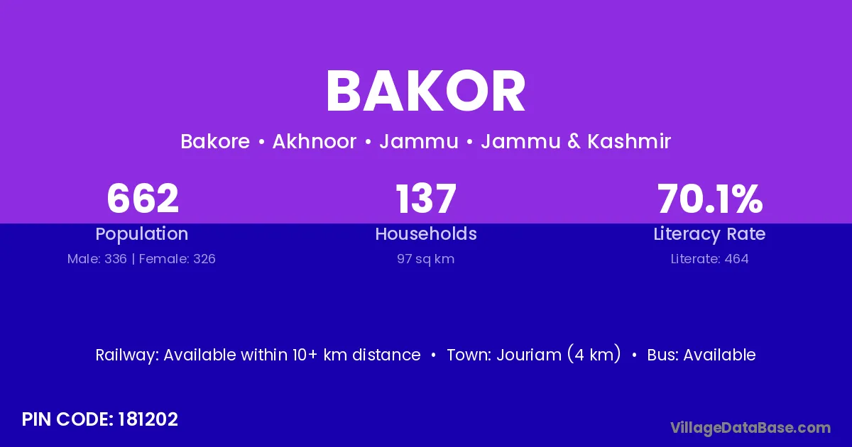 The literacy rate of Bakor village is 63.01%. Male literacy stands at 70.83% and female literacy at 54.68%.