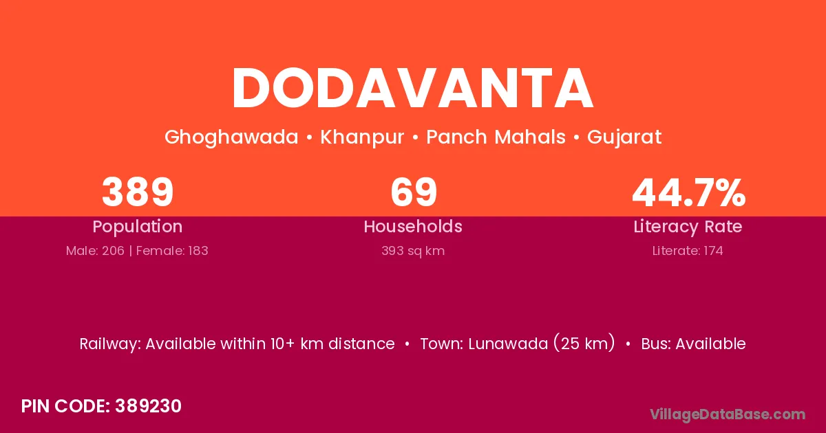 Lunawada (25 km) is the nearest town to Dodavanta village for major economic activities and is located approximately 25 km away.