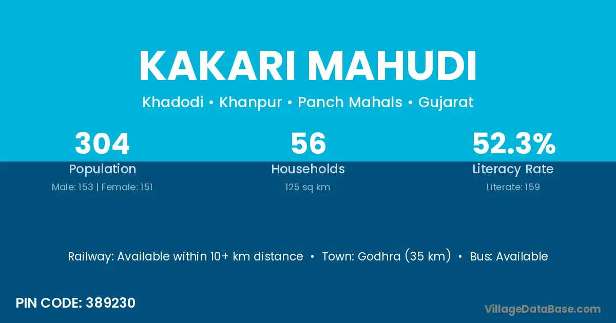 Godhra (35 km) is the nearest town to Kakari Mahudi village for major economic activities and is located approximately 35 km away.