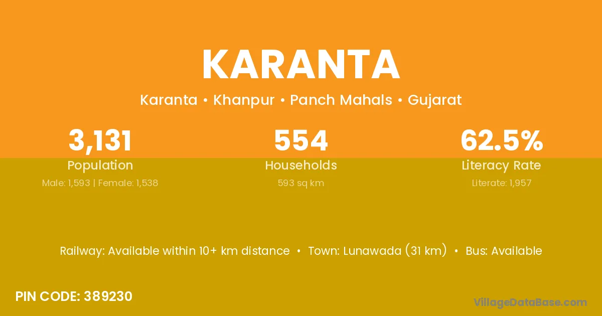 Lunawada (31 km) is the nearest town to Karanta village for major economic activities and is located approximately 31 km away.