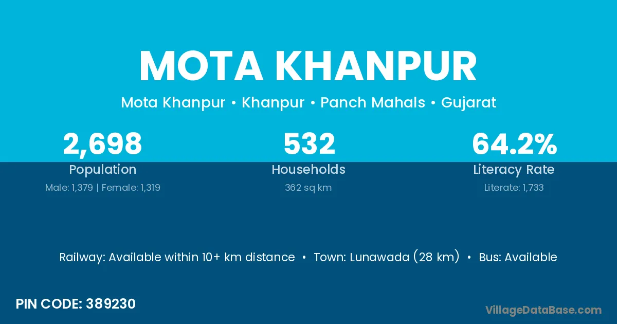 Lunawada (28 km) is the nearest town to Mota Khanpur village for major economic activities and is located approximately 28 km away.