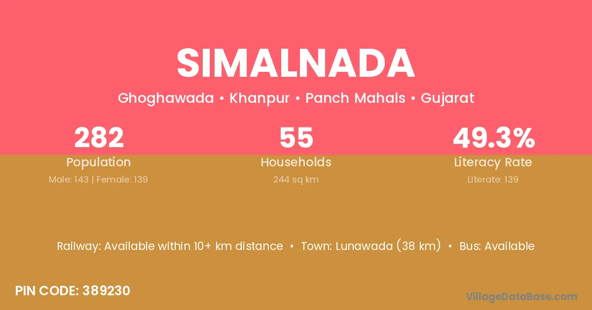 Lunawada (38 km) is the nearest town to Simalnada village for major economic activities and is located approximately 38 km away.