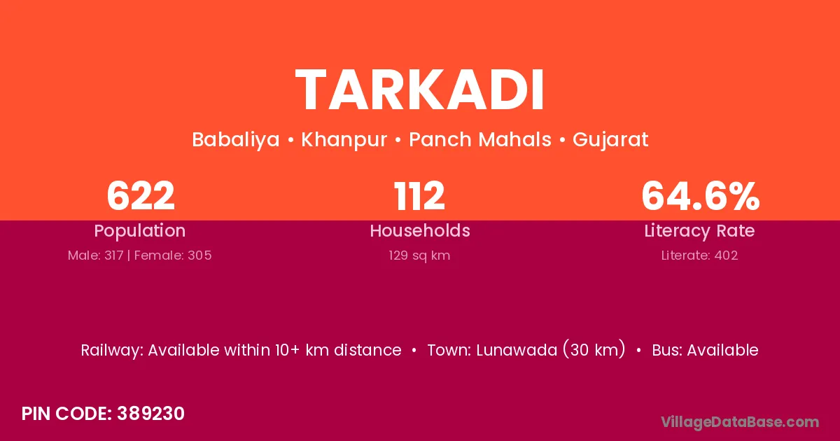 Lunawada (30 km) is the nearest town to Tarkadi village for major economic activities and is located approximately 30 km away.