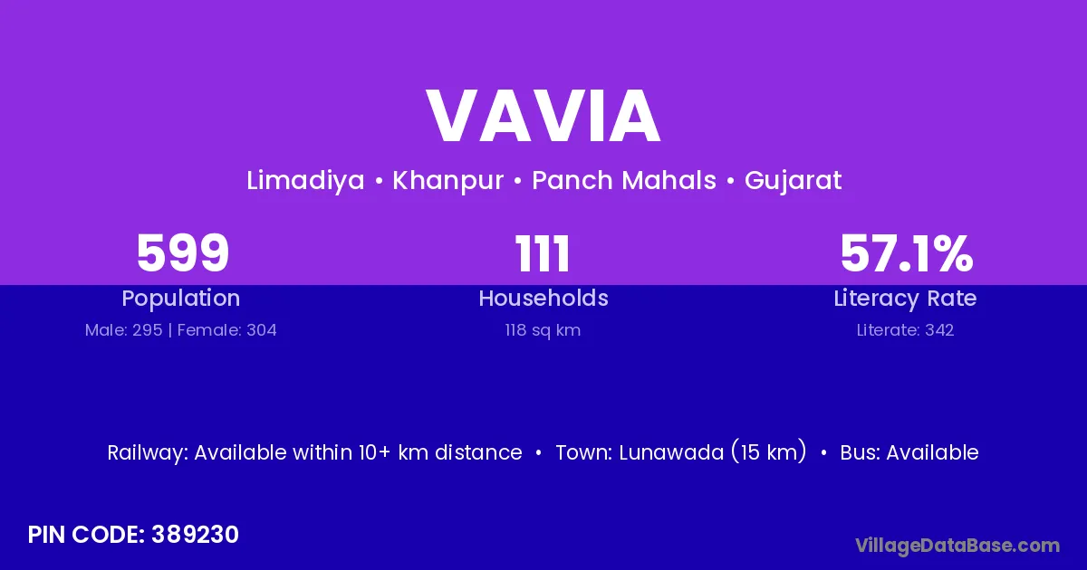 Lunawada (15 km) is the nearest town to Vavia village for major economic activities and is located approximately 15 km away.