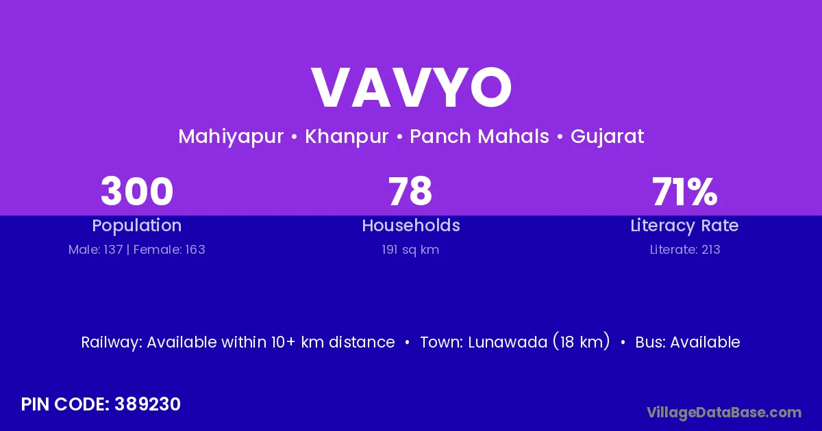 Lunawada (18 km) is the nearest town to Vavyo village for major economic activities and is located approximately 18 km away.
