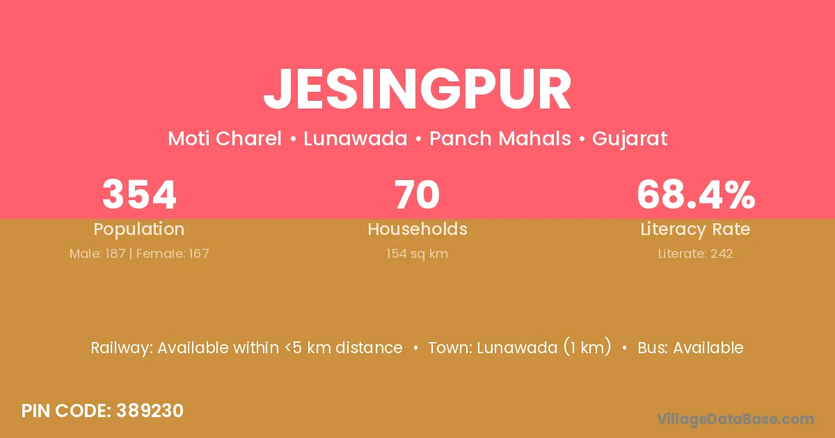 Lunawada (1 km) is the nearest town to Jesingpur village for major economic activities and is located approximately 1 km away.