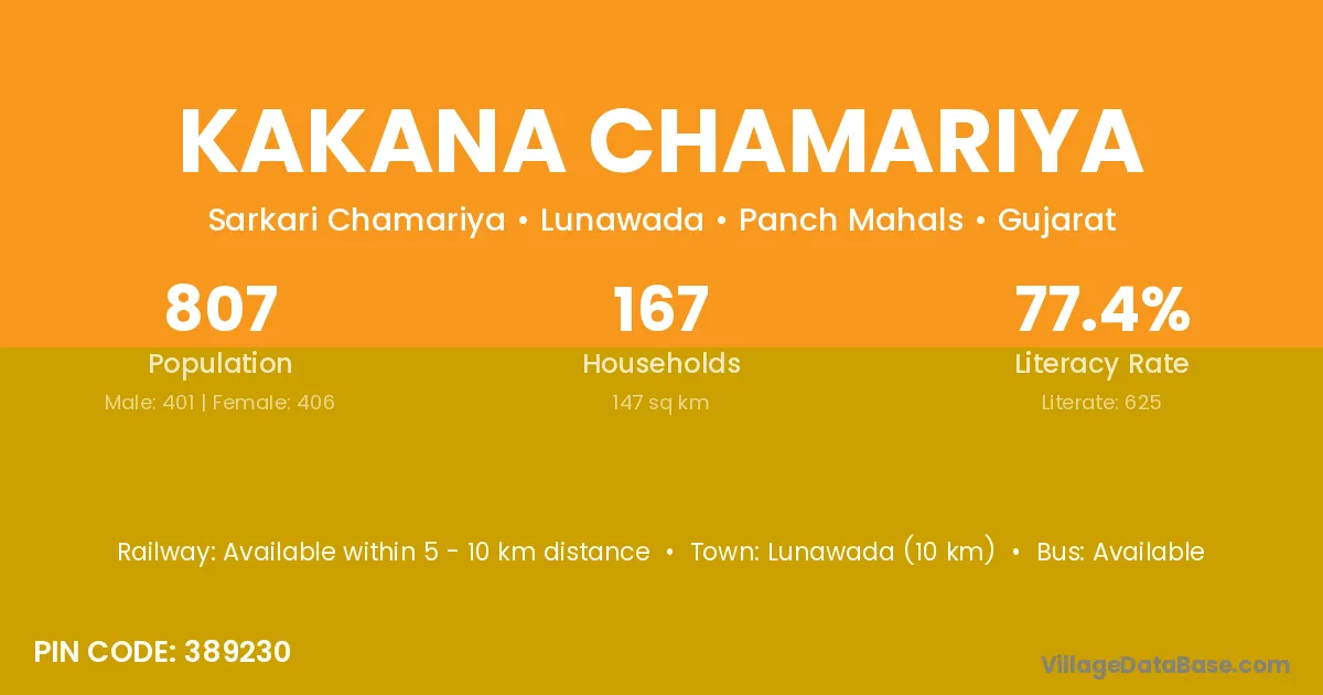 Lunawada (10 km) is the nearest town to Kakana Chamariya village for major economic activities and is located approximately 10 km away.
