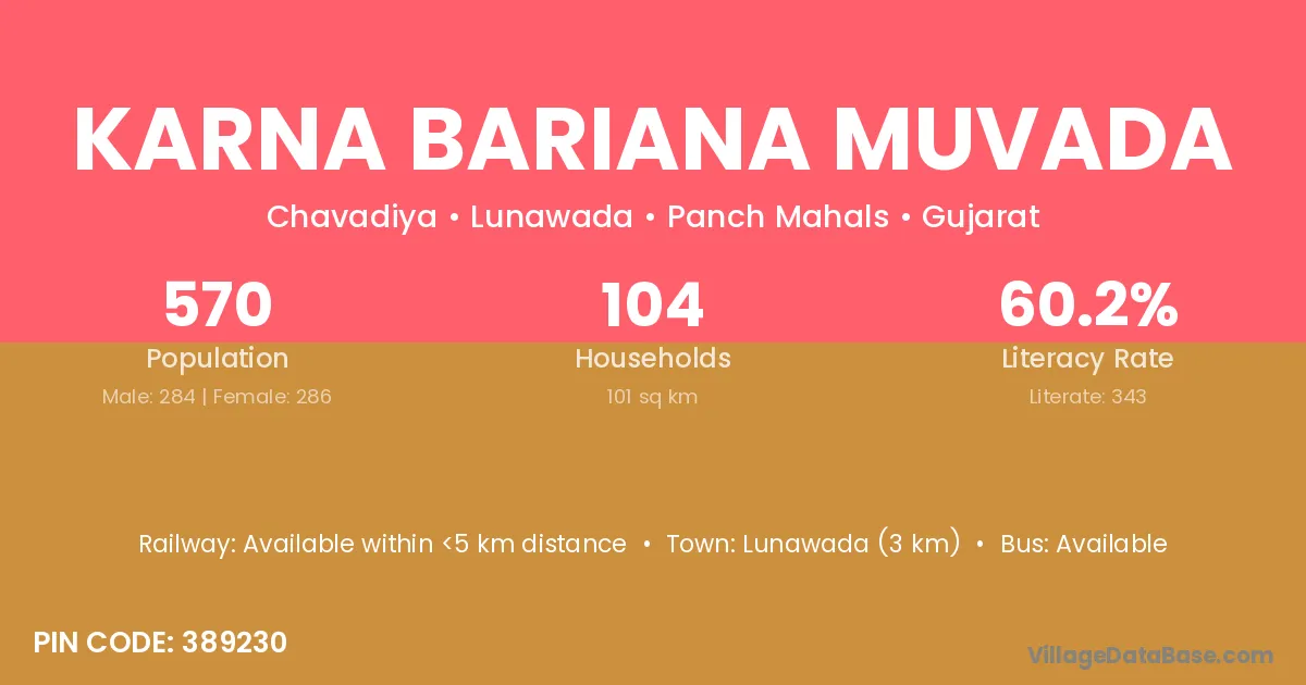 According to Census 2011 information, the village code of Karna Bariana Muvada village is 389230.