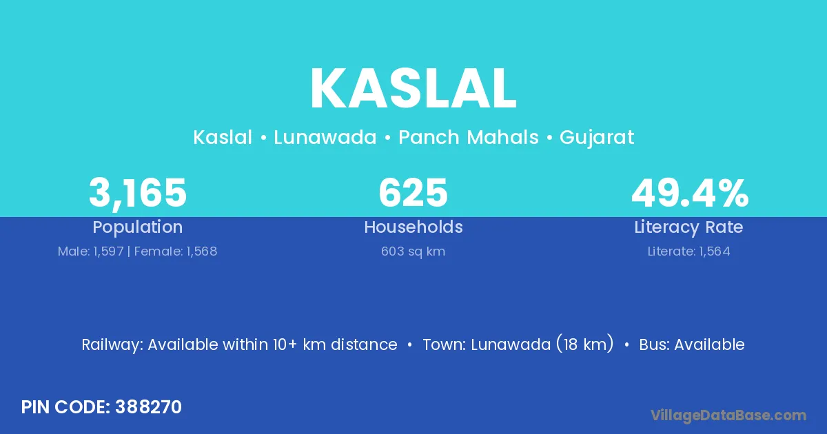 Lunawada (18 km) is the nearest town to Kaslal village for major economic activities and is located approximately 18 km away.