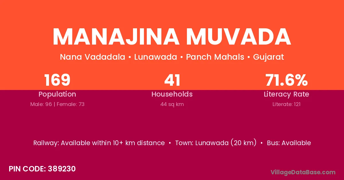 Lunawada (20 km) is the nearest town to Manajina Muvada village for major economic activities and is located approximately 20 km away.