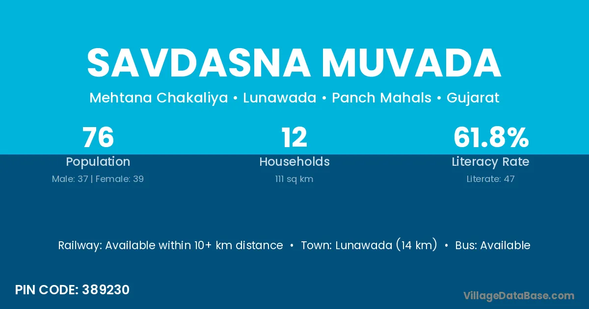 Savdasna Muvada village has a total population of 76 people, of which 37 are males and 39 are females.