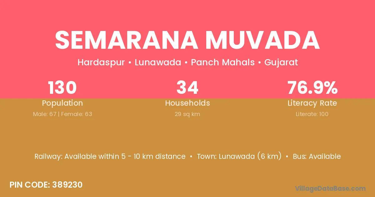 Lunawada (6 km) is the nearest town to Semarana Muvada village for major economic activities and is located approximately 6 km away.