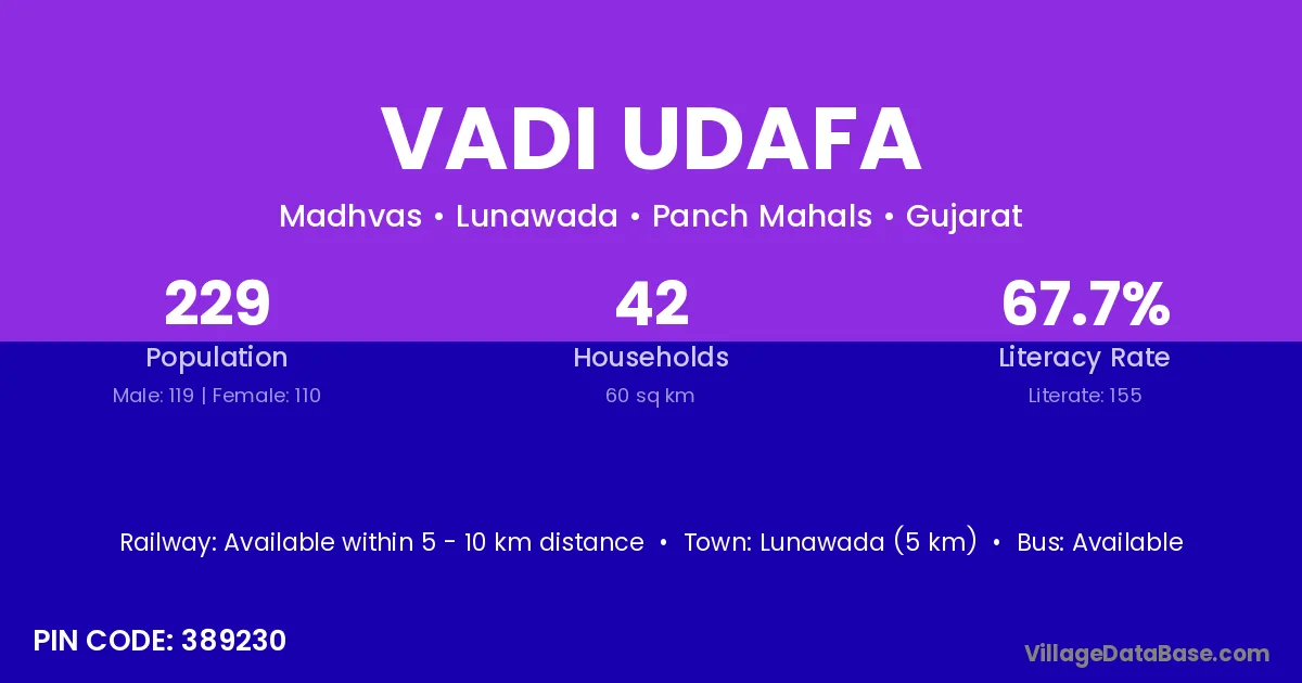 Vadi Udafa village has a total population of 229 people, of which 119 are males and 110 are females.