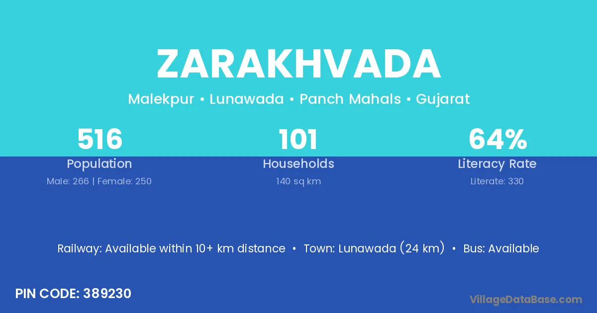 Lunawada (24 km) is the nearest town to Zarakhvada village for major economic activities and is located approximately 24 km away.