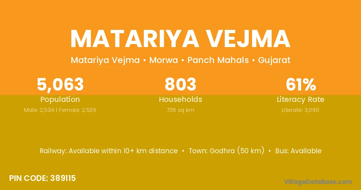 Godhra (50 km) is the nearest town to Matariya Vejma village for major economic activities and is located approximately 50 km away.