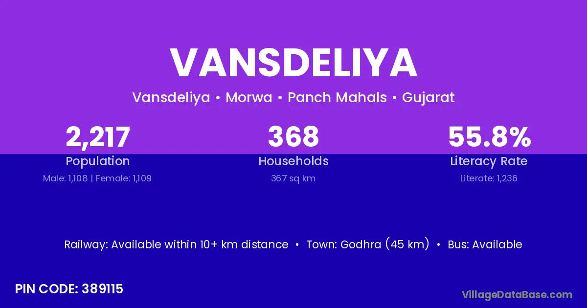 Godhra (45 km) is the nearest town to Vansdeliya village for major economic activities and is located approximately 45 km away.