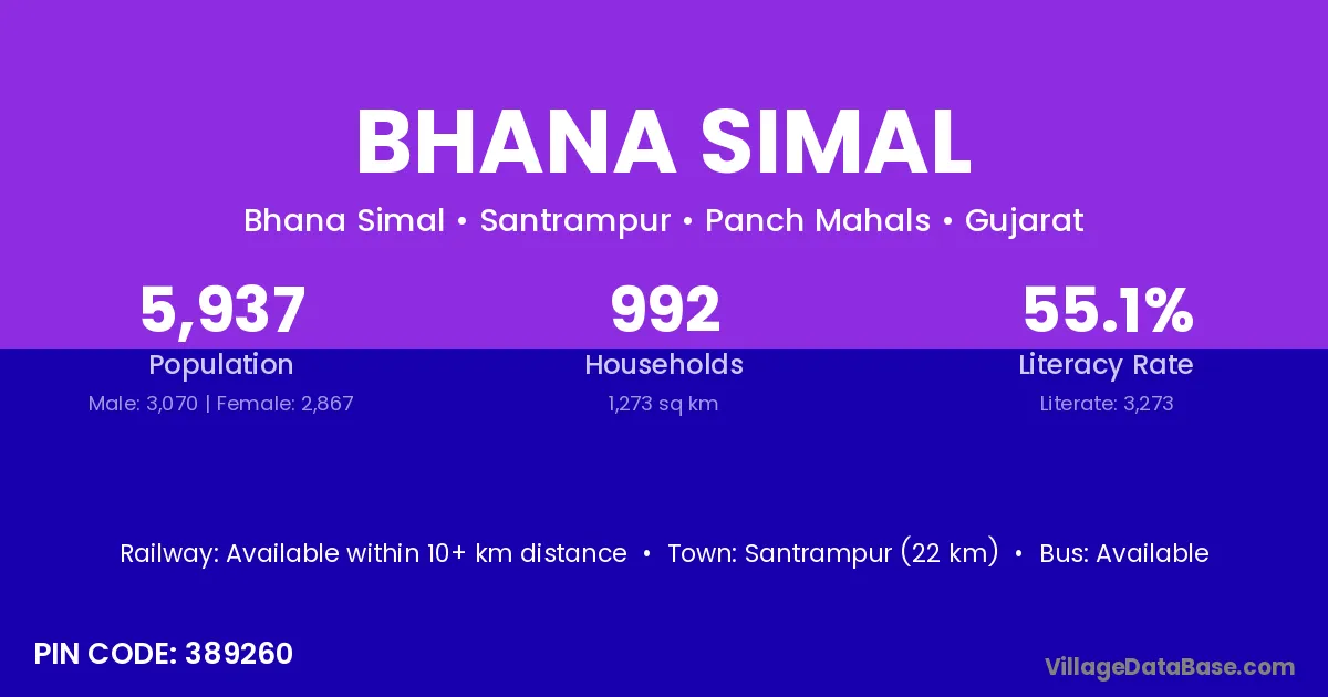 Santrampur (22 km) is the nearest town to Bhana Simal village for major economic activities and is located approximately 22 km away.