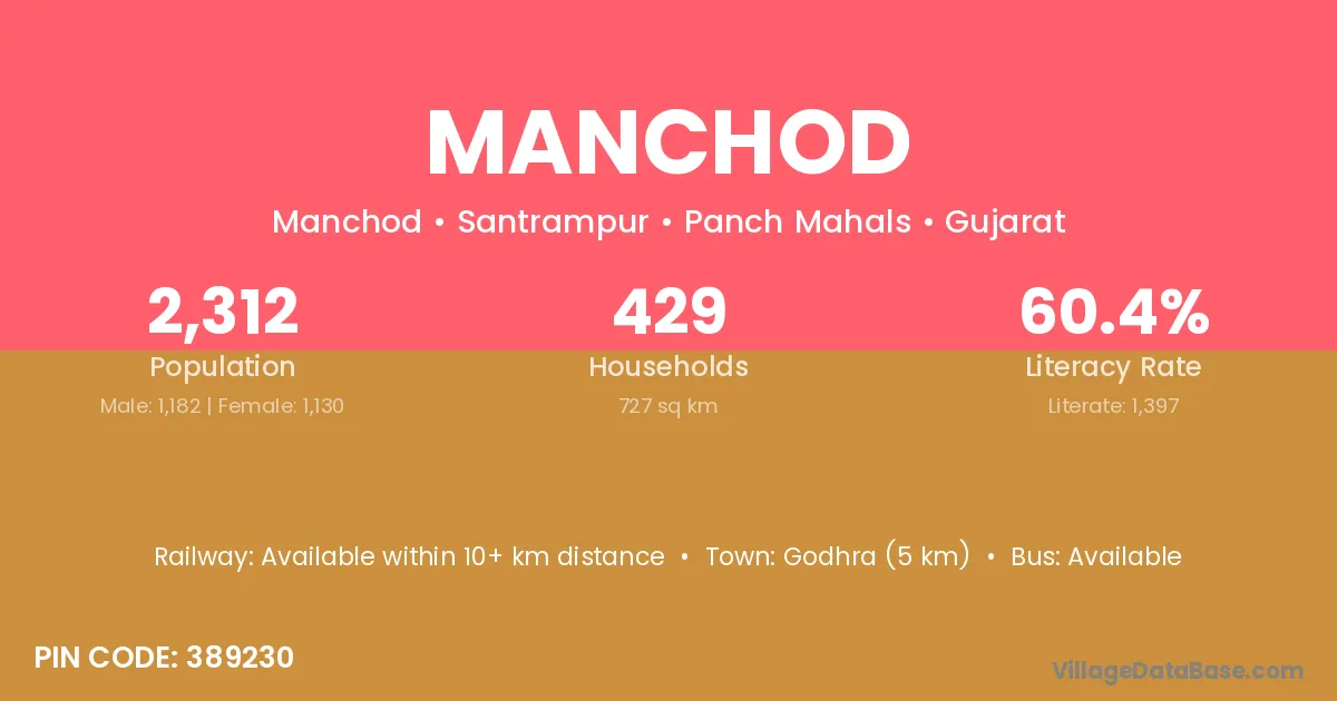 Godhra (5 km) is the nearest town to Manchod village for major economic activities and is located approximately 5 km away.