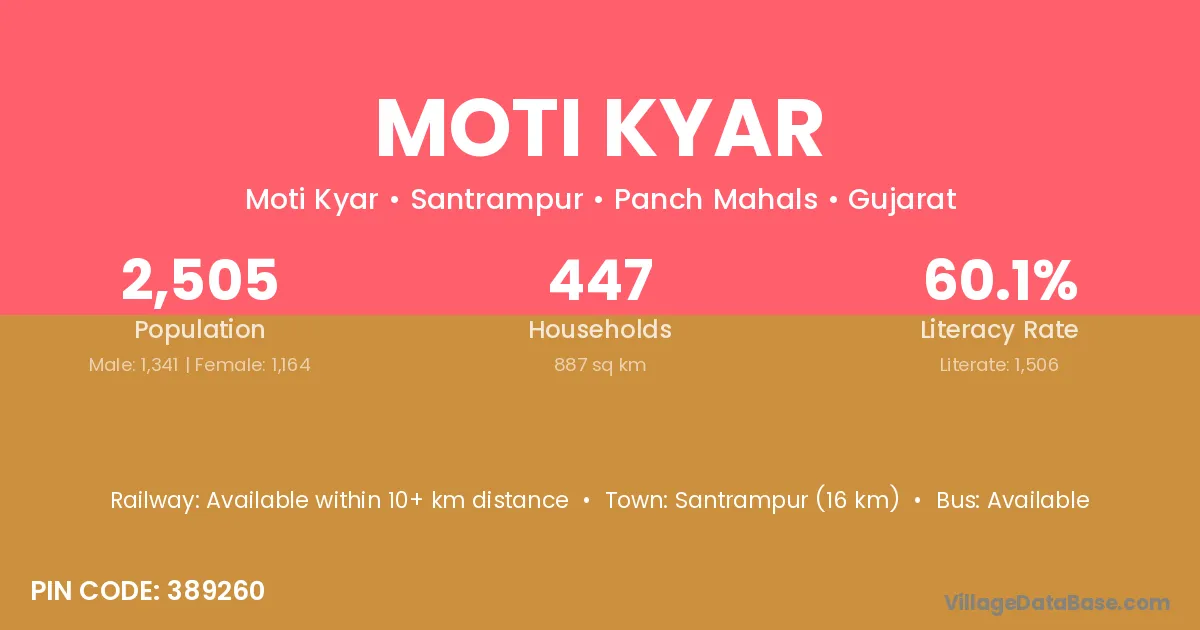 Santrampur (16 km) is the nearest town to Moti Kyar village for major economic activities and is located approximately 16 km away.