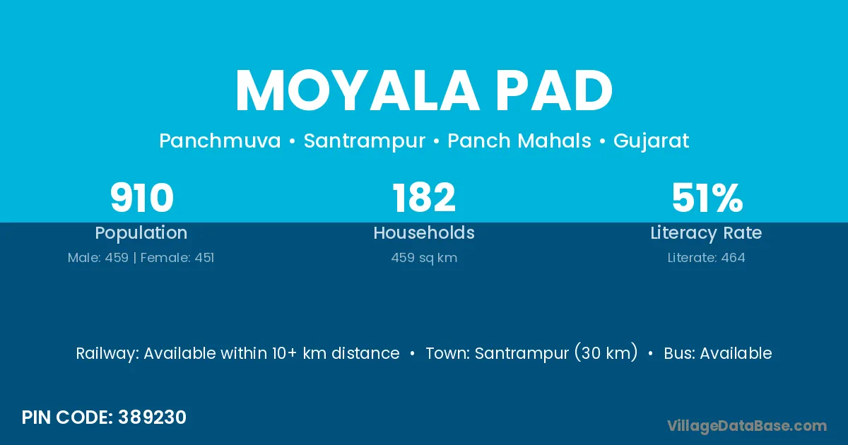 Santrampur (30 km) is the nearest town to Moyala Pad village for major economic activities and is located approximately 30 km away.