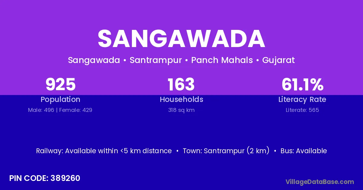 Santrampur (2 km) is the nearest town to Sangawada village for major economic activities and is located approximately 2 km away.