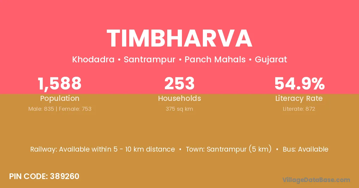Santrampur (5 km) is the nearest town to Timbharva village for major economic activities and is located approximately 5 km away.