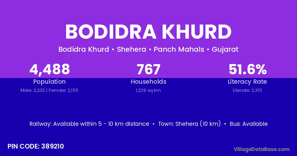 Shehera (10 km) is the nearest town to Bodidra Khurd village for major economic activities and is located approximately 10 km away.