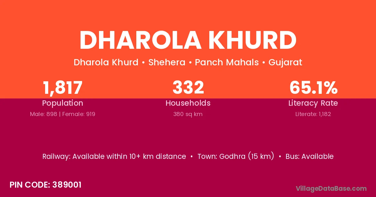 Godhra (15 km) is the nearest town to Dharola Khurd village for major economic activities and is located approximately 15 km away.