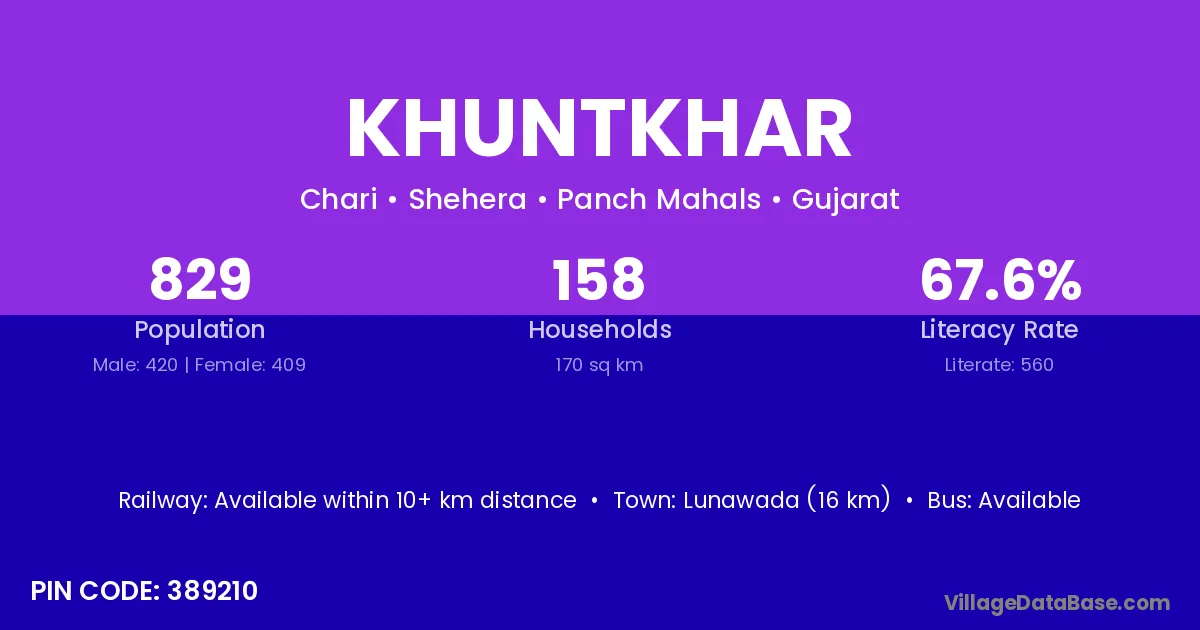 Lunawada (16 km) is the nearest town to Khuntkhar village for major economic activities and is located approximately 16 km away.