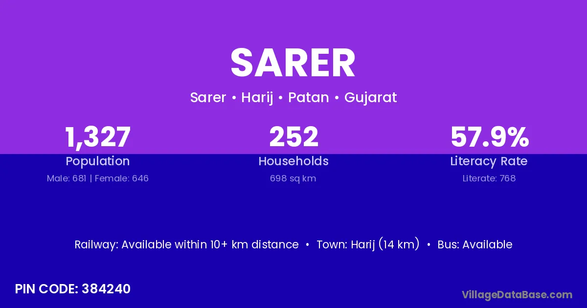 Harij (14 km) is the nearest town to Sarer village for major economic activities and is located approximately 14 km away.