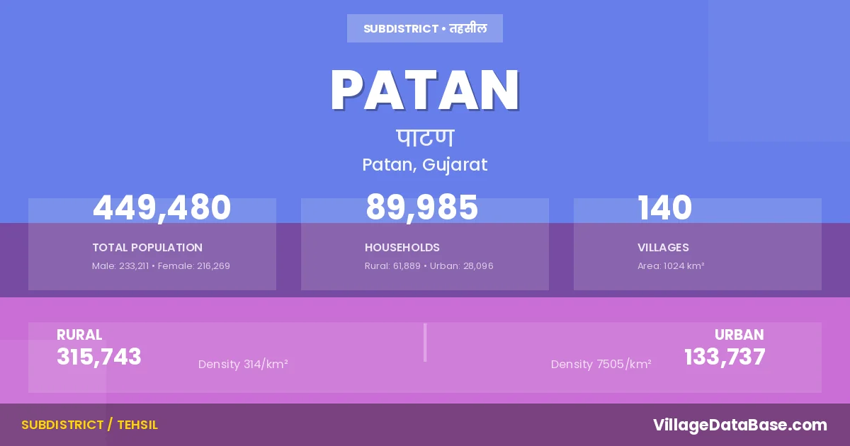 According to the 2011 census The total area of Patan Taluka is 1024 km², with a population of 449480 people. The population density is 439 inhabitants per square kilometre, and there are approximately 89985 houses in the sub district.