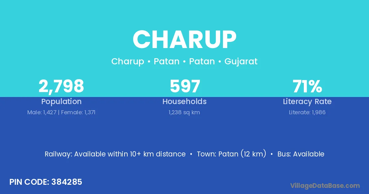 Patan (12 km) is the nearest town to Charup village for major economic activities and is located approximately 12 km away.