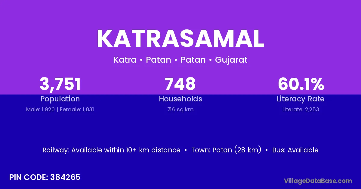 Patan (28 km) is the nearest town to Katrasamal village for major economic activities and is located approximately 28 km away.