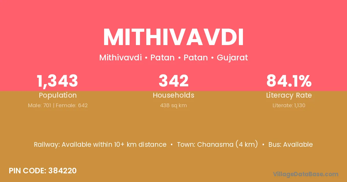 Chanasma (4 km) is the nearest town to Mithivavdi village for major economic activities and is located approximately 4 km away.