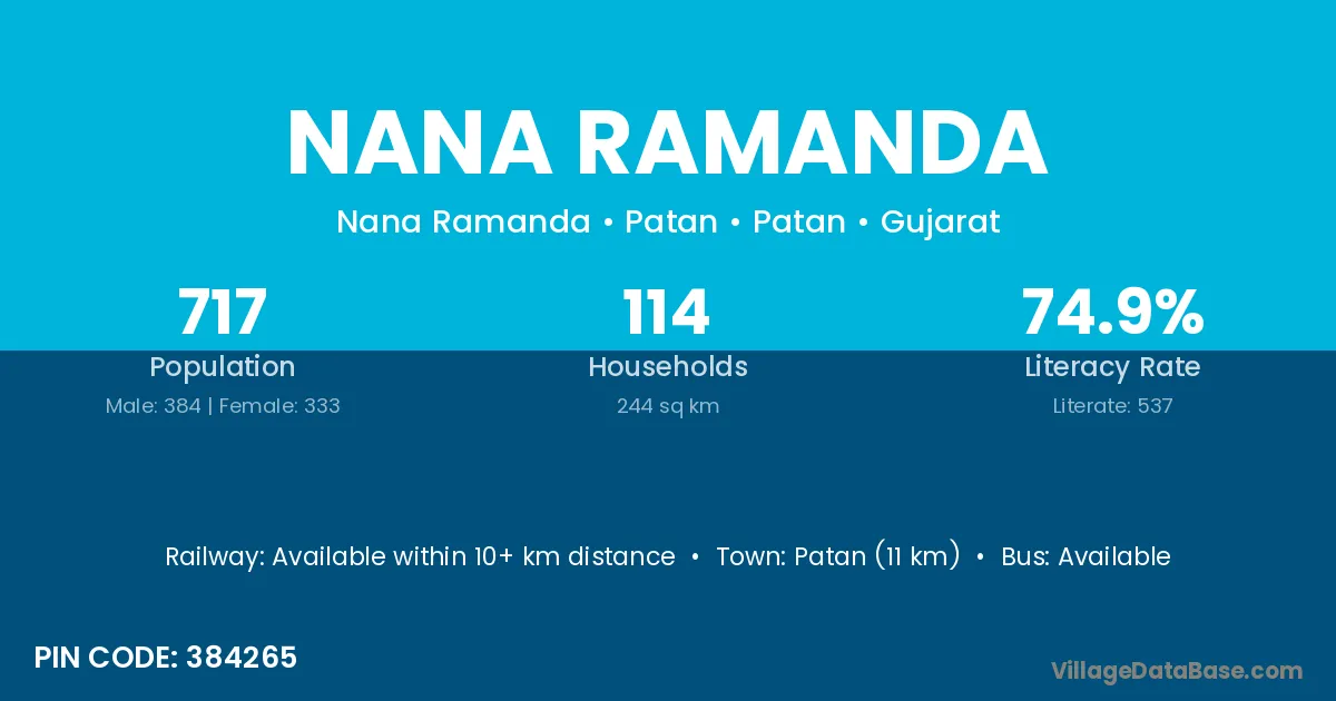 Patan (11 km) is the nearest town to Nana Ramanda village for major economic activities and is located approximately 11 km away.