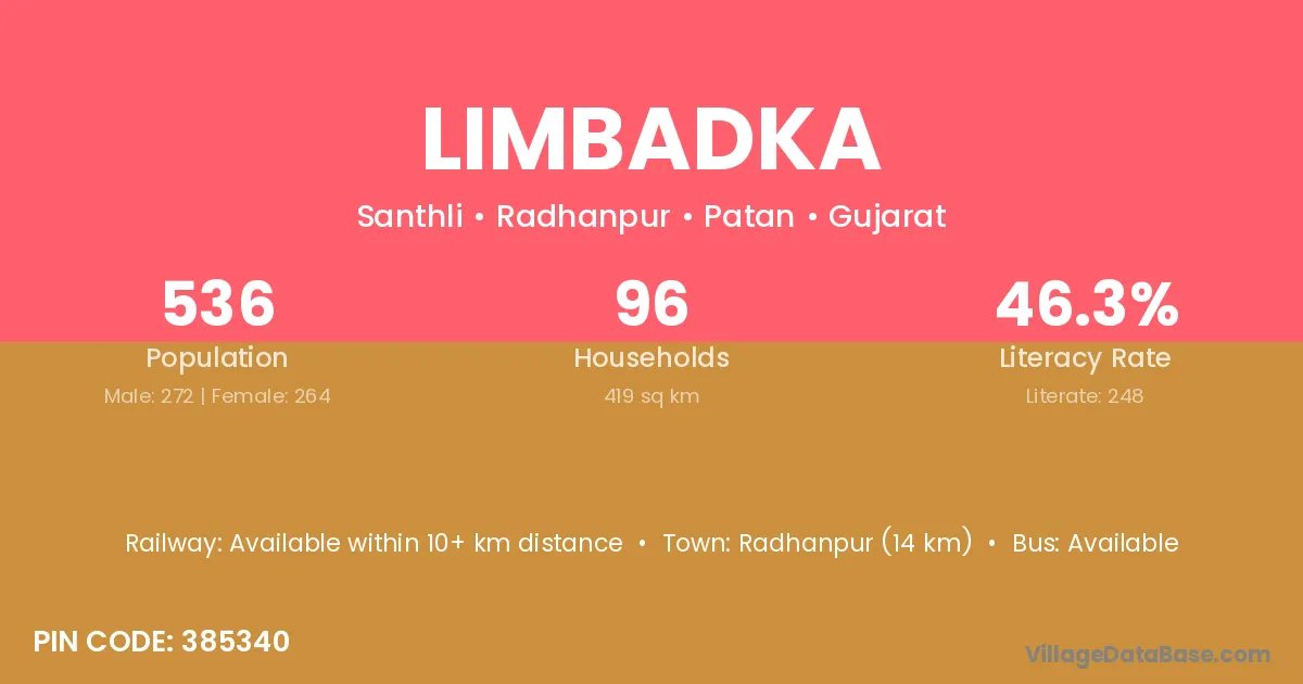 Radhanpur (14 km) is the nearest town to Limbadka village for major economic activities and is located approximately 14 km away.