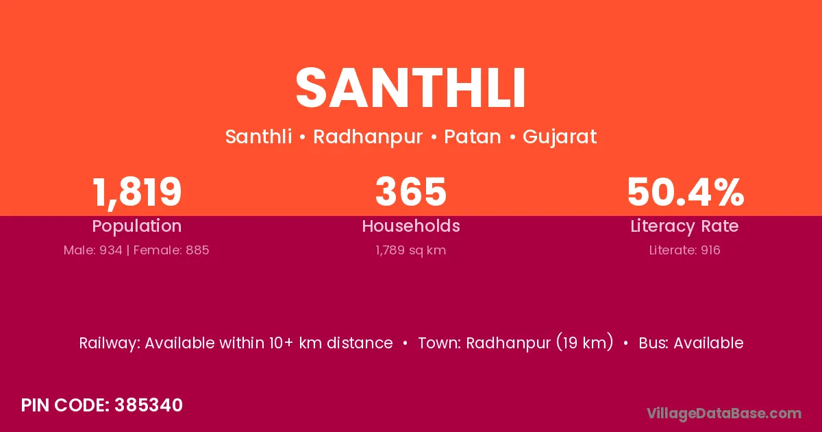 Radhanpur (19 km) is the nearest town to Santhli village for major economic activities and is located approximately 19 km away.