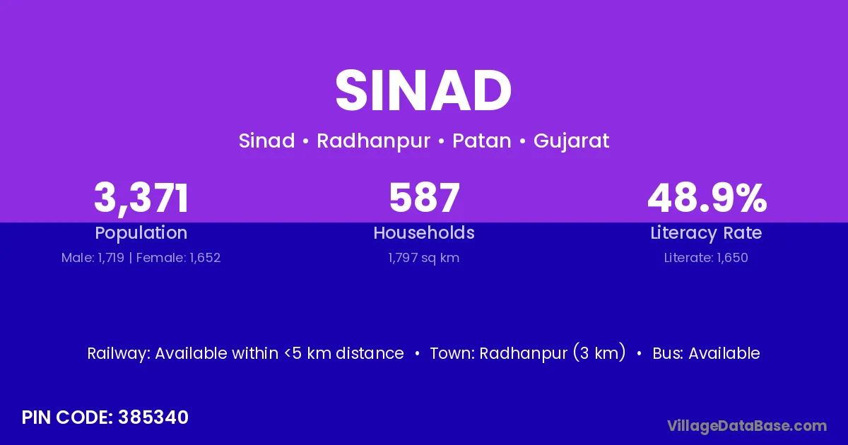 Radhanpur (3 km) is the nearest town to Sinad village for major economic activities and is located approximately 3 km away.