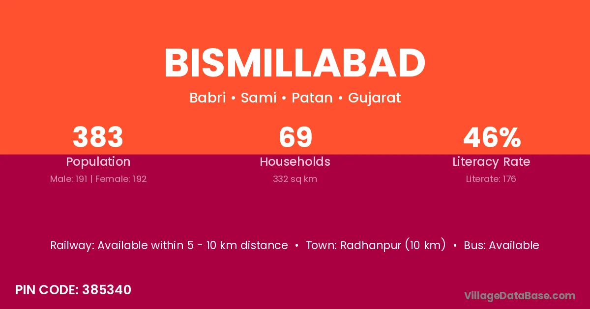 Radhanpur (10 km) is the nearest town to Bismillabad village for major economic activities and is located approximately 10 km away.