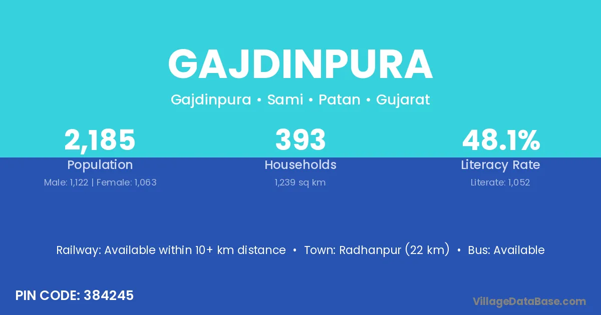 Radhanpur (22 km) is the nearest town to Gajdinpura village for major economic activities and is located approximately 22 km away.