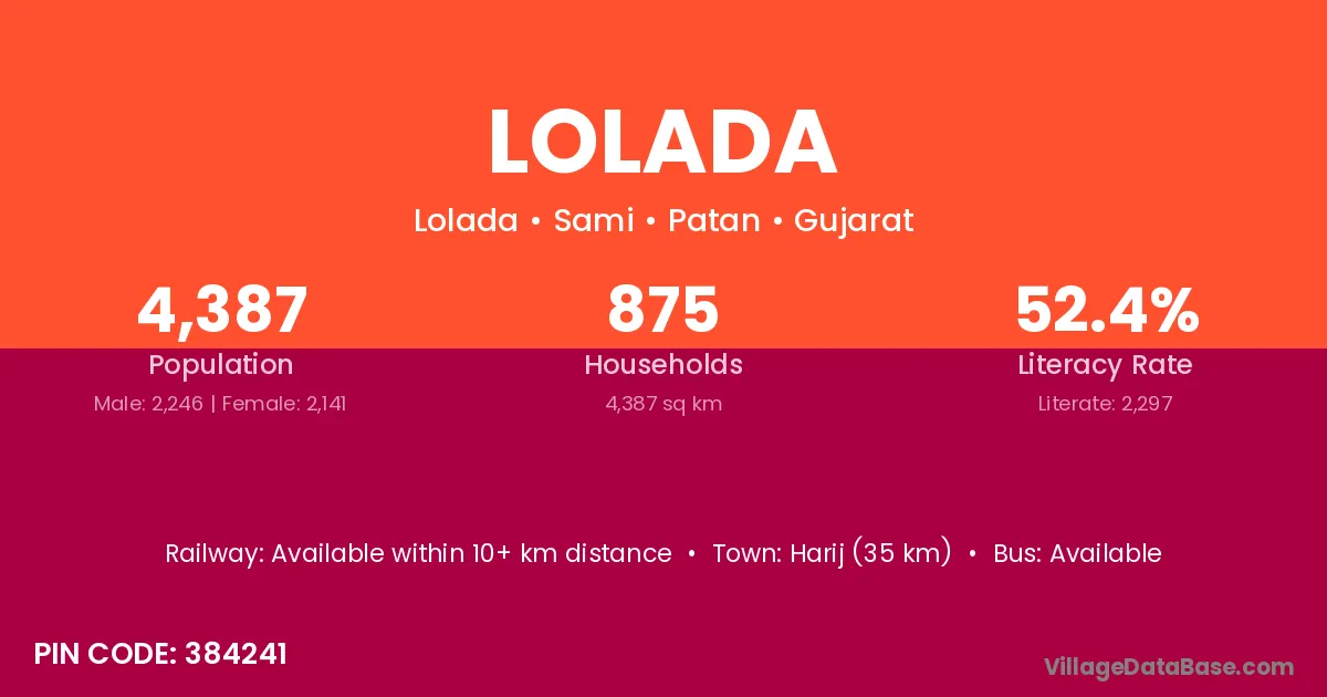 Harij (35 km) is the nearest town to Lolada village for major economic activities and is located approximately 35 km away.