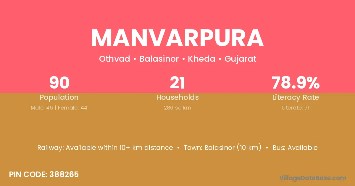Harij (12 km) is the nearest town to Manvarpura village for major economic activities and is located approximately 12 km away.