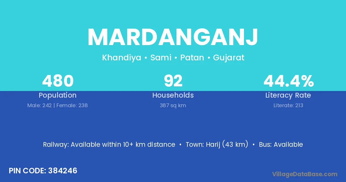 Harij (43 km) is the nearest town to Mardanganj village for major economic activities and is located approximately 43 km away.