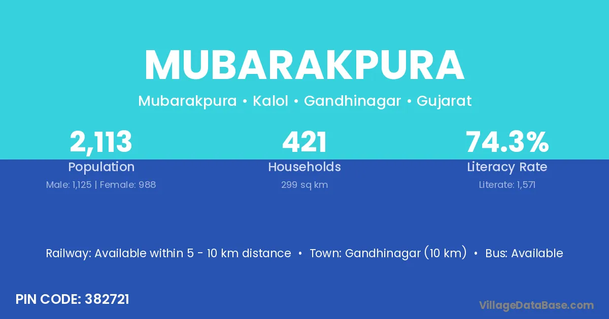 Harij (20 km) is the nearest town to Mubarakpura village for major economic activities and is located approximately 20 km away.