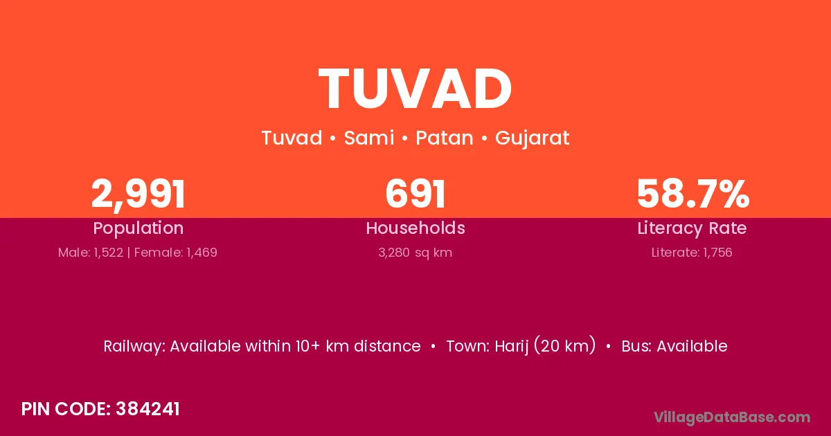 Harij (20 km) is the nearest town to Tuvad village for major economic activities and is located approximately 20 km away.