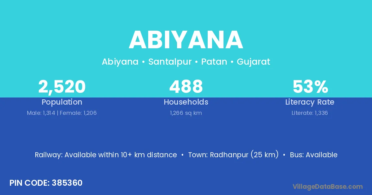 Radhanpur (25 km) is the nearest town to Abiyana village for major economic activities and is located approximately 25 km away.
