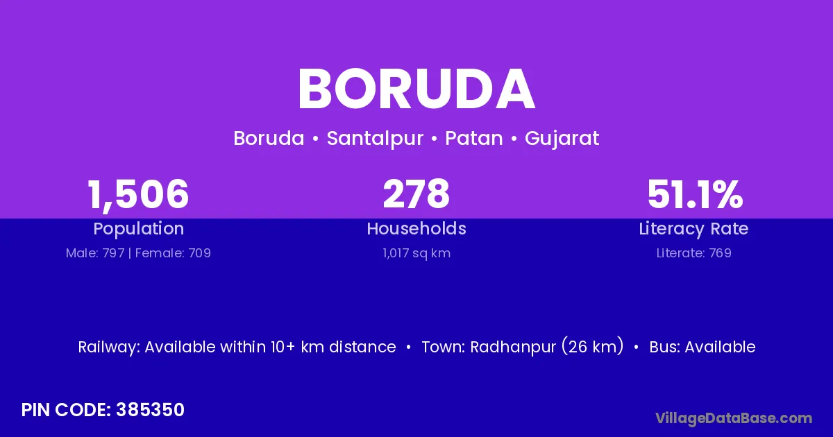 Radhanpur (26 km) is the nearest town to Boruda village for major economic activities and is located approximately 26 km away.